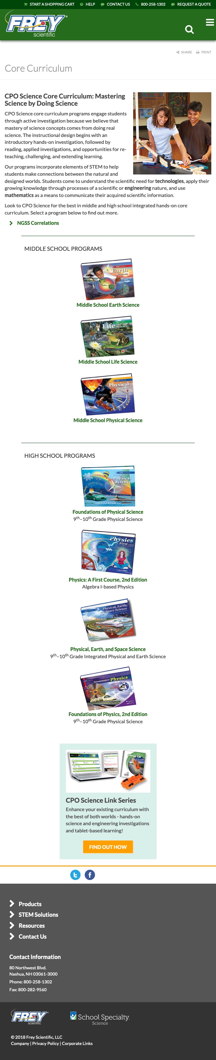 CPO Science is another brand at School Specialty, and its website also ran on DotNetNuke prior to 2016 and was difficult to update. At some point earlier that year, the decision was made to make CPO Science part of Frey Scientific. This resulted in CPO Science's website relaunching as a section of the newly-relaunched Frey Scientific website. The consolidation would continue in 2022 when both brands as well as Delta Education would move to sections of School Specialty's own website.