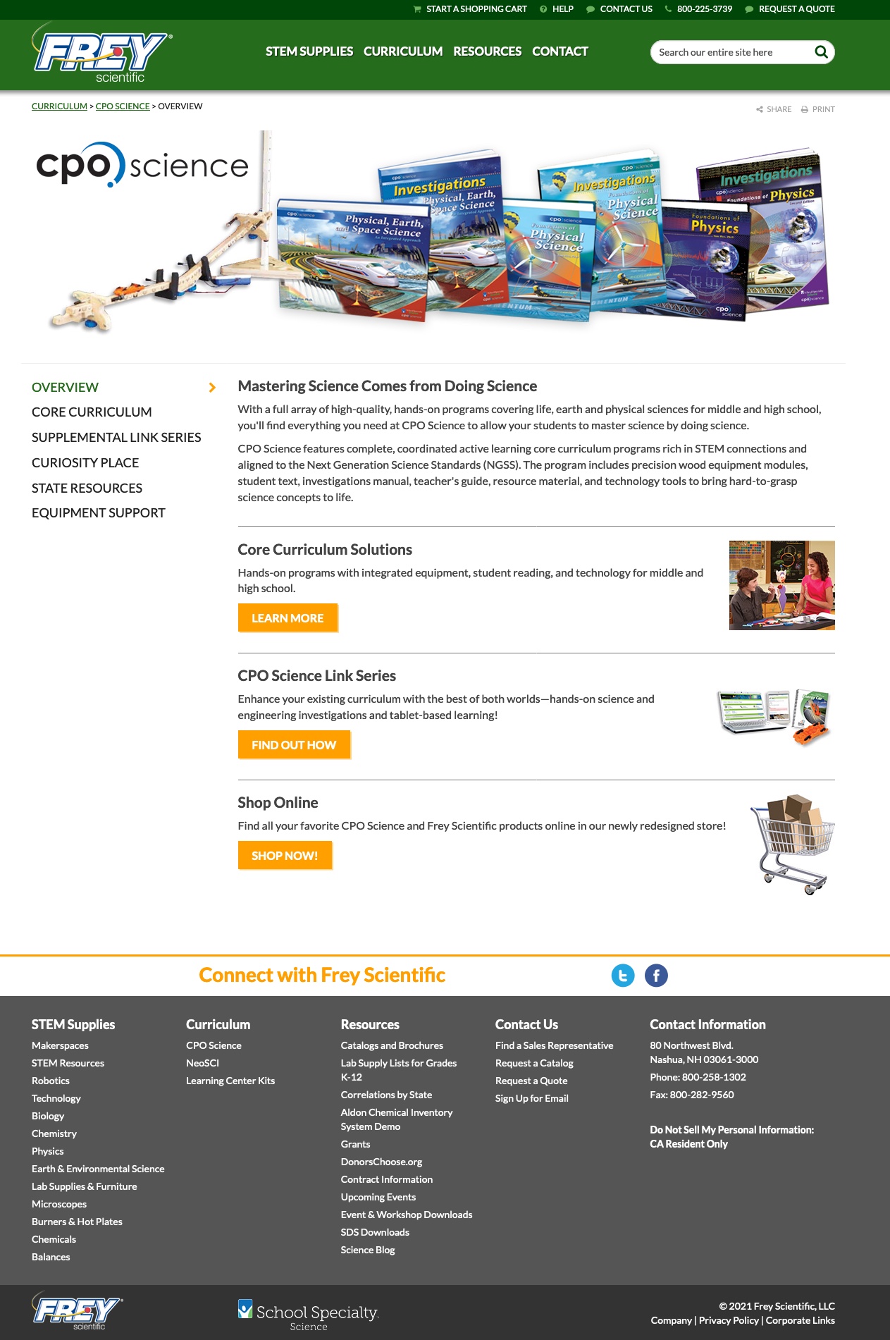 CPO Science is another brand at School Specialty, and its website also ran on DotNetNuke prior to 2016 and was difficult to update. At some point earlier that year, the decision was made to make CPO Science part of Frey Scientific. This resulted in CPO Science's website relaunching as a section of the newly-relaunched Frey Scientific website. The consolidation would continue in 2022 when both brands as well as Delta Education would move to sections of School Specialty's own website.